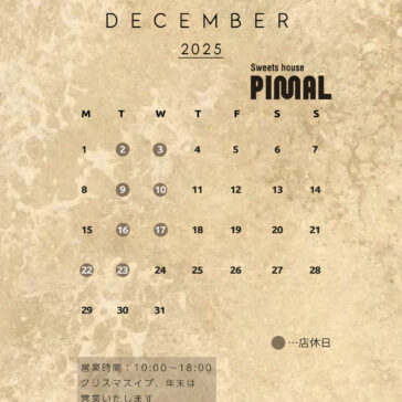 12月の営業日カレンダーです。 営業時間は10:00~18:00となります。 クリスマスイブは営業いたしますが、22日(月)はお休みとなります。年末は休まず営業いたします。 みなさまのご来店を心よりお待ちしております。 […]